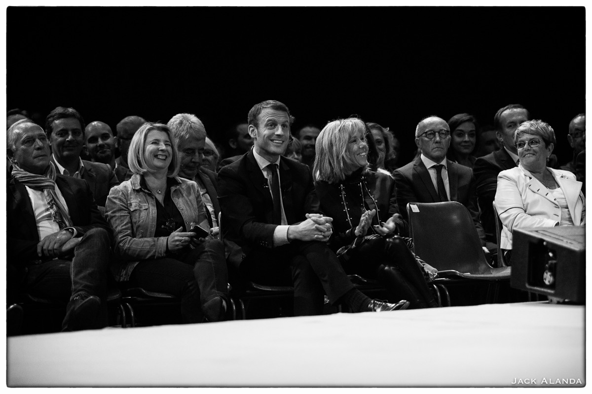 La tension retombe. La foule boit les paroles de son tribun, dissertant sur les centaines de personnes qui n’ont pu rentrer et que pourtant nous n’avons pas vues. L’attachée de presse tente de nous faire la morale et est aussitôt prise à partie par d’autres photographes. Plus distrayante est la pathétique tentative d’excuse d’une autre, terrorisée à l’idée que nous ayons enregistré tous les échanges. Je me fais le plaisir de lui montrer un enregistrement en cours. Quelques hésitants hourras accueillent de temps à autres les variations sémantiques de Macron, dont les paroles se perdent dans l’immensité d’une salle à moitié vide. Nous décidons de nous replier chez nous.