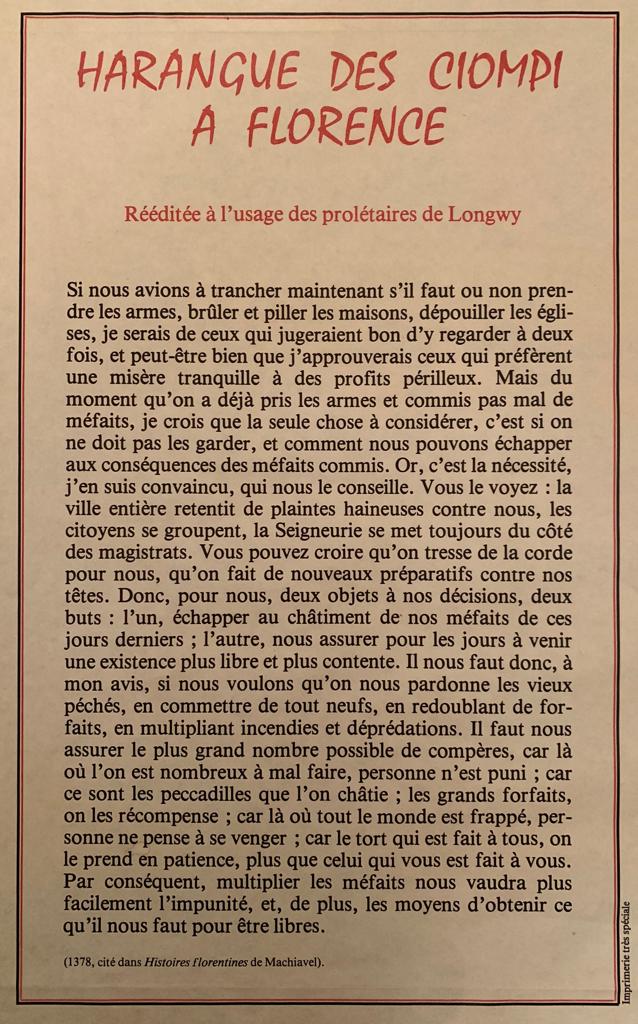 Si nous avions à trancher maintenant s’il faut ou non prendre les armes, brûler et piller les maisons, dépouiller les églises, je serais de ceux qui jugeraient bon d’y regarder à deux fois, et peut-être bien que j’approuverais ceux qui préfèrent une misère tranquille à des profits périlleux. Mais du moment qu’on a déjà pris les armes et commis pas mal de méfaits, je crois que la seule chose à considérer, c’est si on ne doit pas les garder, er comment nous pouvons échapper aux conséquences des méfaits commis. Or, c’est la nécessité, j’en suis convaincu, qui nous le conseille. Vous le voyez : la ville entière retentit de plaintes haineuses contre nous, les citoyens se groupent, la Seigneurie se met toujours du côté des magistrats. Vous pouvez croire qu’on tresse de la corde pour nous, qu’on fait de nouveaux préparatifs contre nos têtes. Donc, pour nous, deux objets à nos décisions, deux buts : l’un, échapper au châtiment de nos méfaits de ces jours derniers ; l’autre, nous assurer pour les jours à venir une existence plus libre et plus contente. Il nous faut donc, à mon avis, si nous voulons qu’on nous pardonne les vieux péchés, en commettre de tout neufs, en redoublant de forfaits, en multipliant incendies et déprédations. Il faut nous assurer le plus grand nombre possible de compères, car là où l’on est nombreux à mal faire, personne n’est puni ; car ce sont les peccadilles que l’on châtie ; les grands forfaits, on les récompense ; car l où tout le monde est frappé, personne ne pense à se venger ; car le tort qui est fait à tous, on le rend en patience, plus que celui qui vous est fait à vous. Par conséquent, multiplier les méfaits nous vaudra plus facilement l’impunité, et, de plus, les moyens d’obtenir ce qu’il nous faut pour être libres.