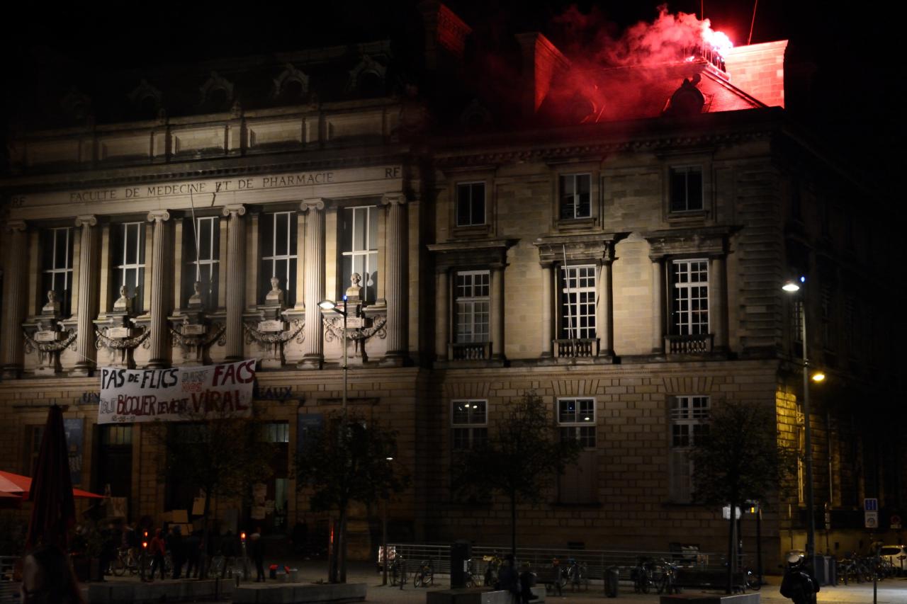 Le premier blocage du campus Victoire, en plein centre ville, a lieu le 1er mars. Les quelques barricades érigées dans les rues alentours sont démontées par la police. Le 6 mars, l’amphi Gintrac est occupé. C’est une visée juste. C’est une façon de persister. C’est un tournant. La direction de l’université va commettre un impair. Elle a la bêtise de se montrer sous son vrai jour, et faire ce qui, depuis les années 60, est connu pour être un catalyseur de révolte : elle fait pénétrer la police dans l’université. Les étudiants sont évacués de manière extrêmement violente.