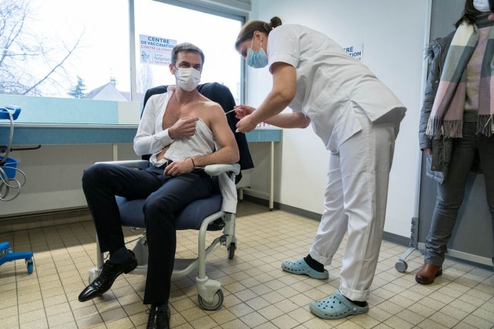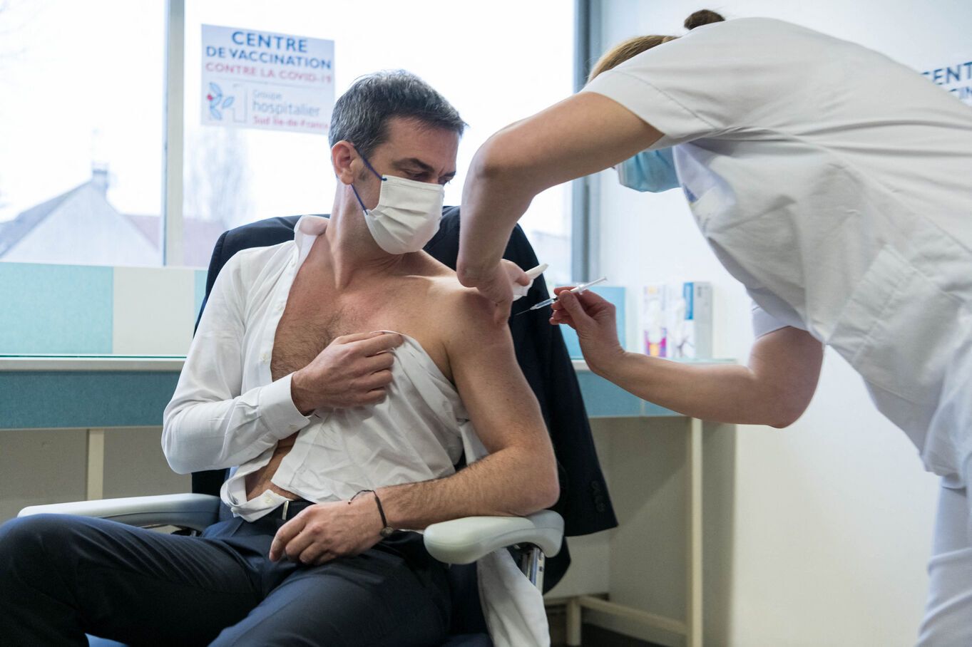 Le 8 février 2021, le ministre de la santé Olivier Véran se faisait vacciner contre le coronavirus devant un parterre de journalistes et de caméras. Or, sur les photos qui rendent compte de cet événement à la dimension très symbolique, un détail attire l’attention : le ministre essaye de manière très visible de cacher son téton. La pose est si peu naturelle qu’elle en est presque comique.