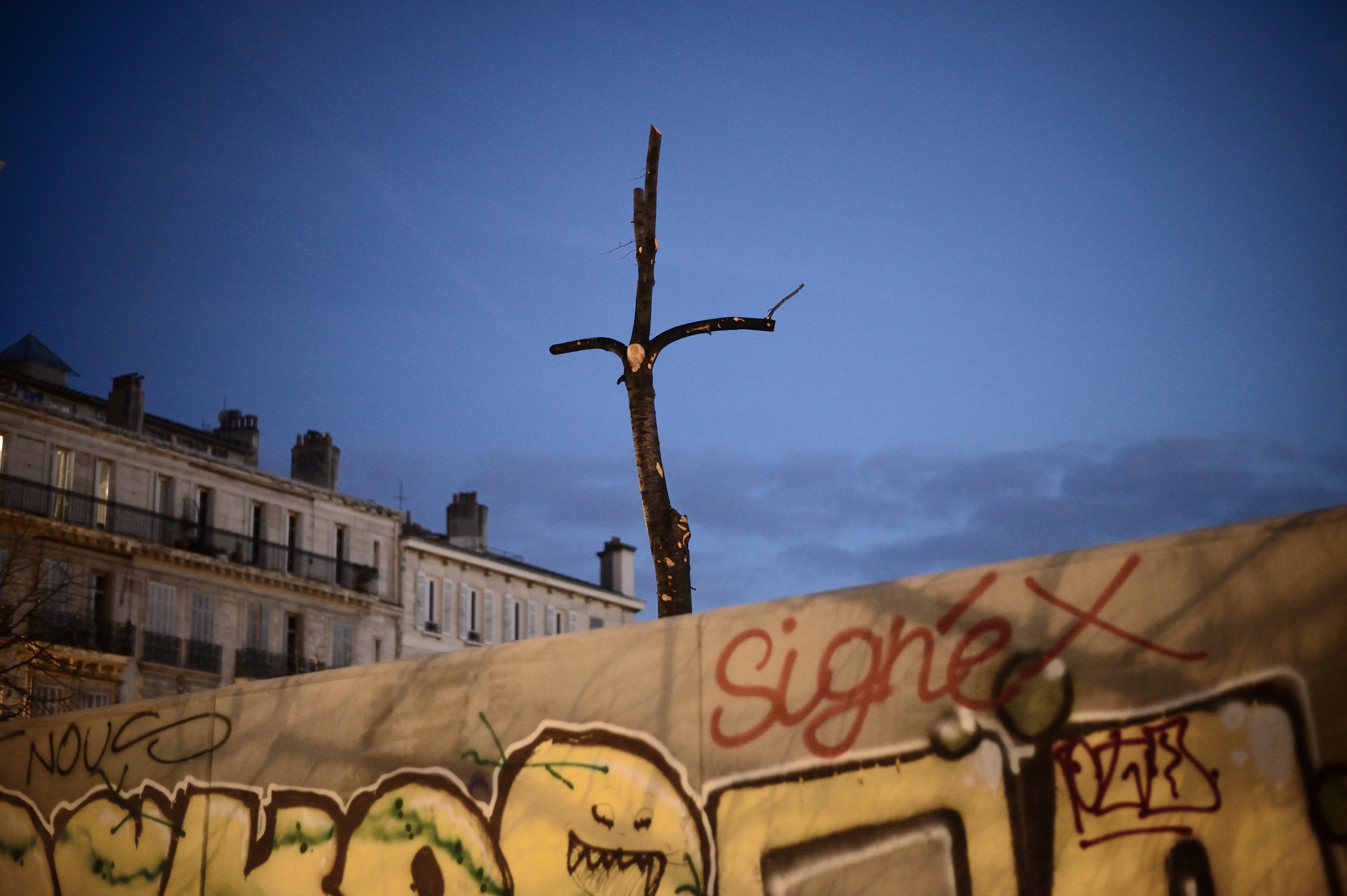 Plus d’un mois donc. De matraquages, d’arrestations, de procès, d’intimidations, et une volonté unique : faire table rase. Créer la sidération par la violence, avec ses rangées de CRS mobilisés à chaque journée d’opération. Empêcher tout retour en arrière par la coupe mortifère de 40 des 115 arbres de la place, la destruction des grilles et des espaces de vie, les blocs de béton et la fermeture complète des accès à la place. Sans aucune information pour les des habitant-e-s et commerçant-e-s.