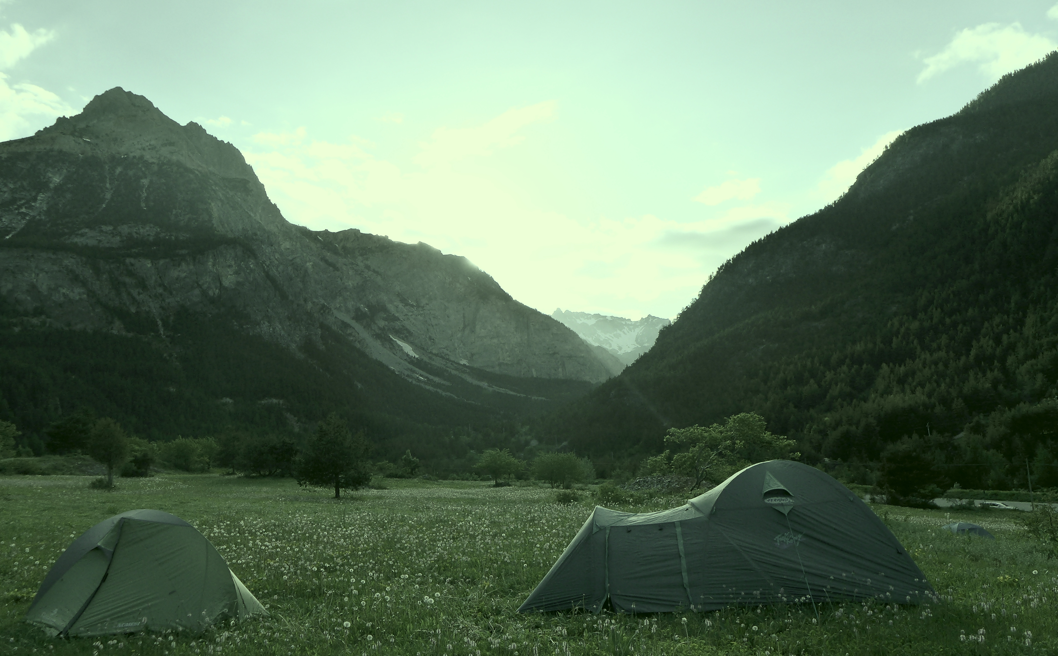 Avec la répression subie par les 3 de Briançon, avec la présence de la DIGOS, les personnes étaient prudentes. Le premier matin, quand le camp était encore en Italie, ils étaient sur la route à prendre des photos des gens présents. Apparemment ils étaient déjà là la veille, c’est une police politique qui semble tout droit venue de l’ère fasciste, entre la BAC et la DGSI. Cela entraînait un rejet des caméras collectif, à part la personne en charge de l’automédia, il était déconseillé de prendre des photos des personnes. C’est pour cela que les photos de ce texte ne comportent personne dans le champ. Par respect pour celle-ux qui se bougent pour entretenir la solidarité dans les Alpes, pour celle-ux qui les traversent. Pour ne pas donner d’arme à la police ou aux fascistes.