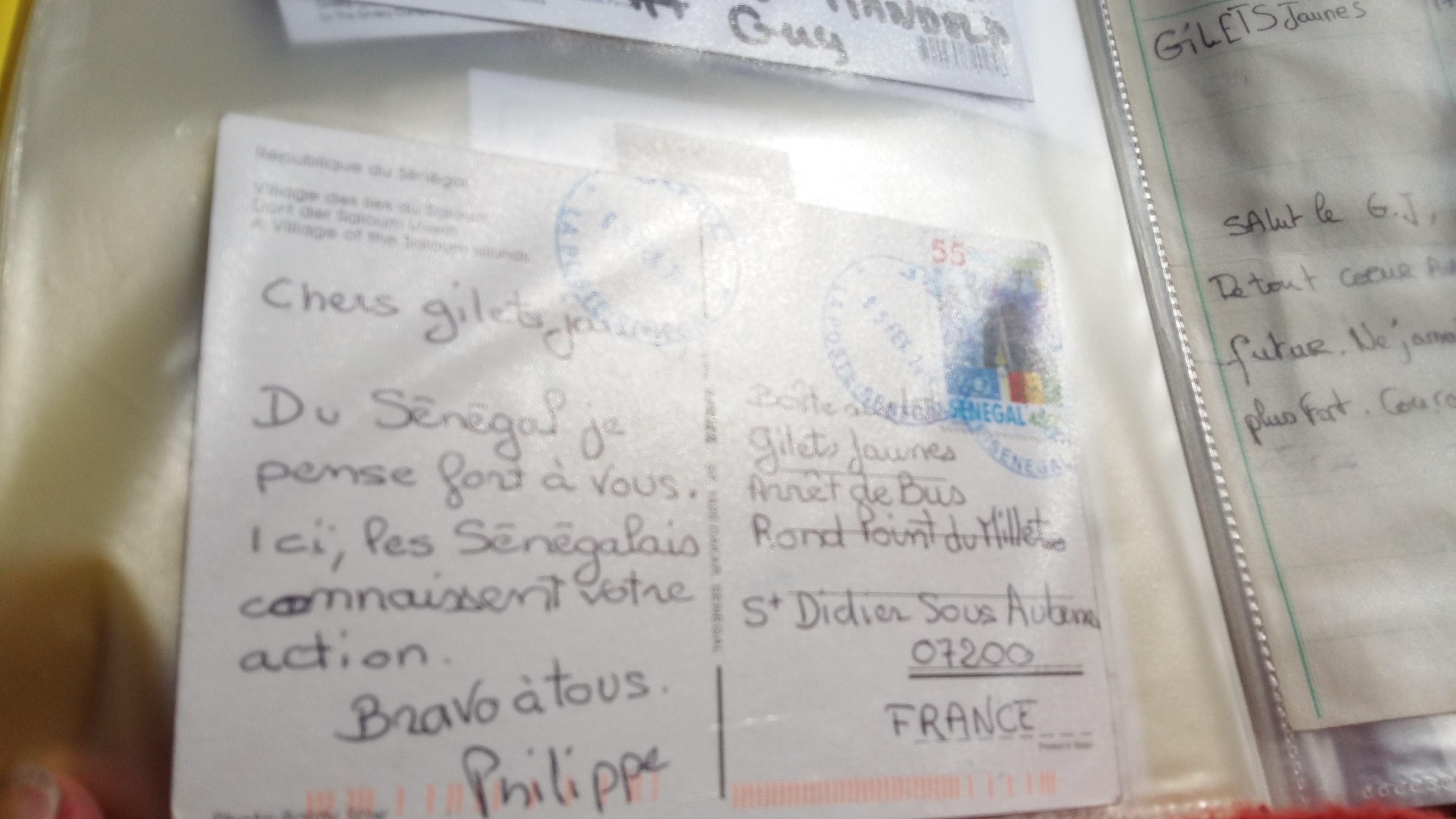 S’ils étaient ailleurs en manifestation ou en assemblée, elle serait là quand même la boite aux lettres jaune, accrochée à un pilier de l’arrêt des cars « rond-point de Millet.... » et le facteur la déposerait dans la boîte... Les GJ la recueilleraient le soir même ou le lendemain... Elle viendrait d’un autre département ou mieux du Niger, du Sénégal, d’Irlande, du Danemark, de Belgique... Les GJ du rond-point ont tout un album de ces cartes postales timbrées avec le cachet de la poste qui fait foi...Ce sont des cartes sur lesquelles on peut lire un mot doux, de soutien, de solidarité ou simplement un bonjour d’ailleurs à ici pour dire : « on est là « partout... de partout et à destination de partout... »