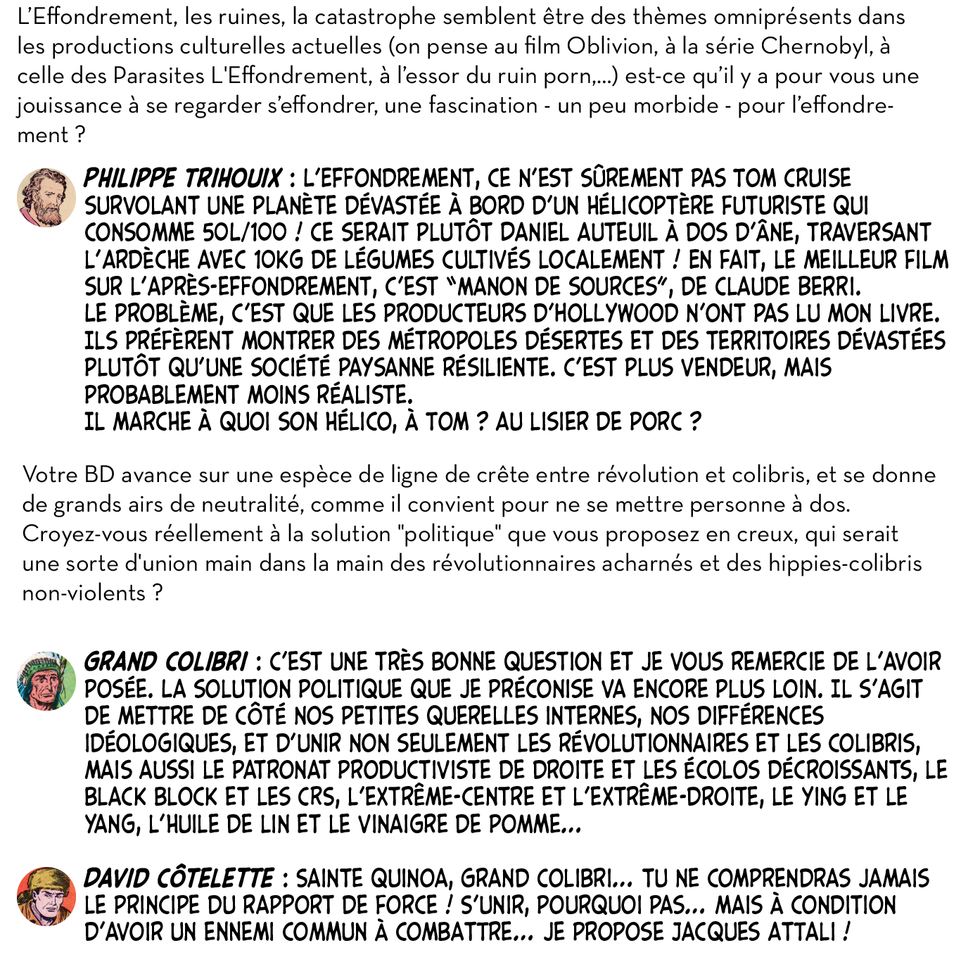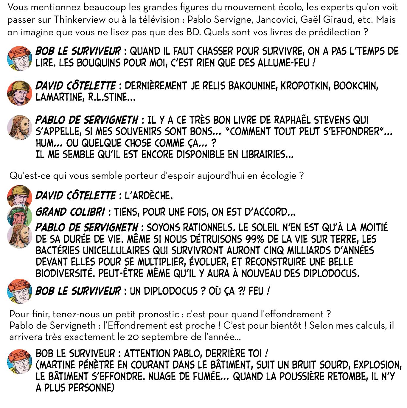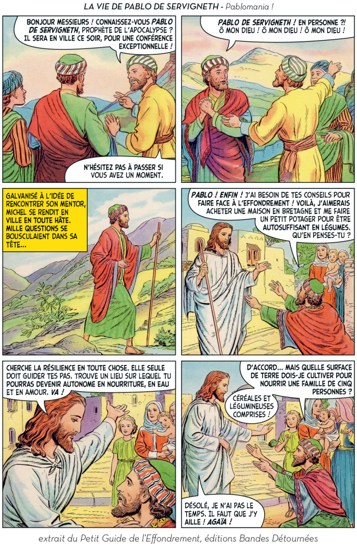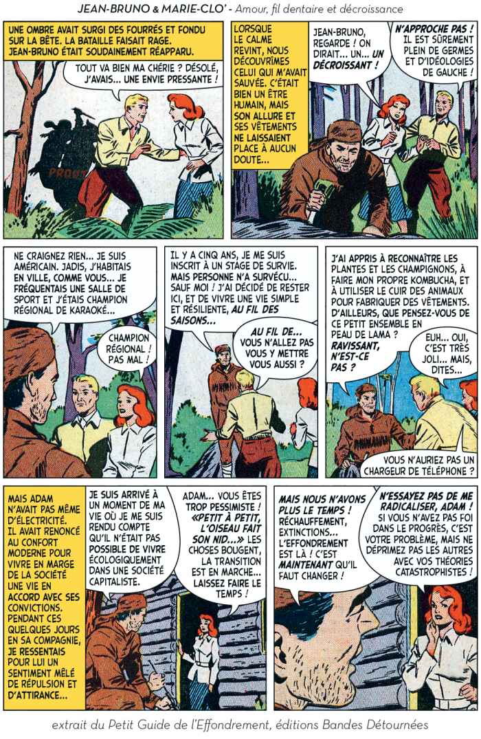 Ou plutôt, ils ont utilement caricaturé les diverses impostures qui foisonnent autour d’un thème devenu à la mode et de ses différentes récupérations politiciennes, survivalistes, universitaires ou marchandes. Dans leur Petit guide de l’effondrement, c’est aussi tout le petit milieu des effondristes et autres collapsonautes qui est amicalement représenté, avec ses grandes figures (Servigne, Bihouix, les radicaux, les non violents) et ses petites névroses. Fait notable, la production de la BD a pu profiter d’une campagne d’auto-financement très réussie, réalisant plus de 2000 préventes sur 100 initialement prévues. Pour y voir plus clair dans les raisons de ces caricatures et dans les objectifs de ces artistes qui prétendent nous faire vivre la fin du monde « dans la joie et la bonne humeur », Désobéissance Ecolo Paris est allé leur poser quelques questions. Les malicieux auteurs ont préféré laisser la parole à leurs personnages.