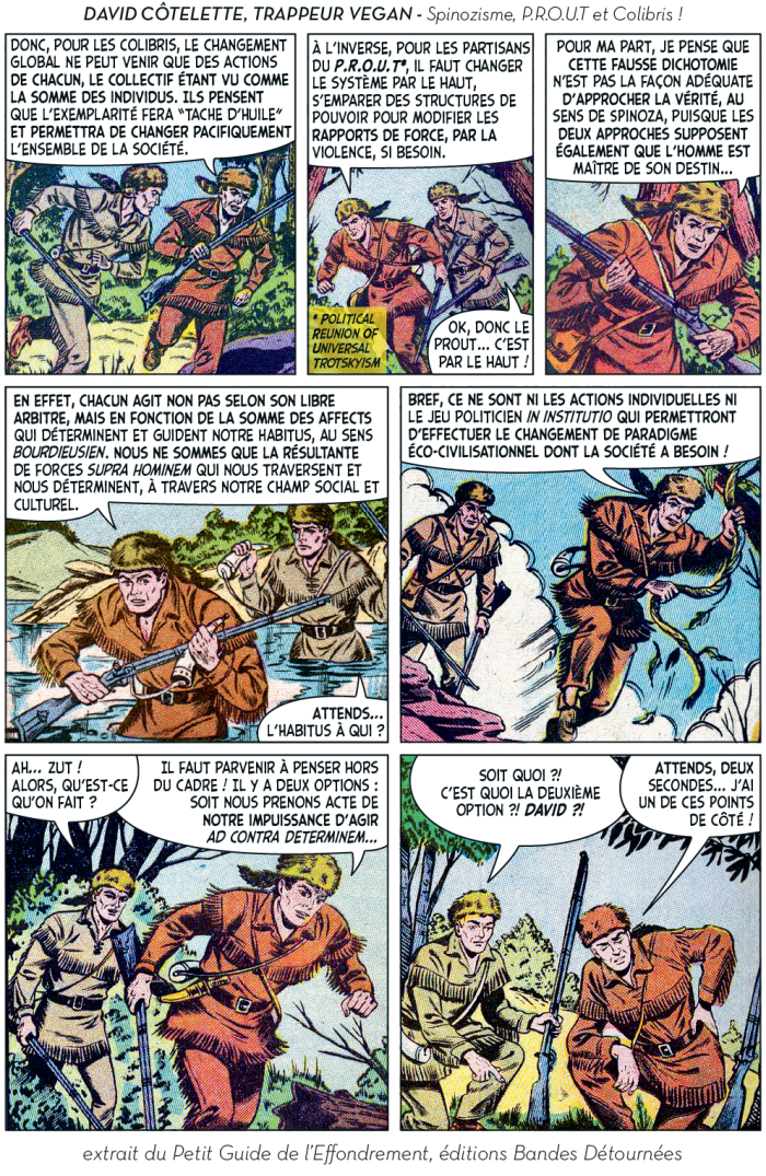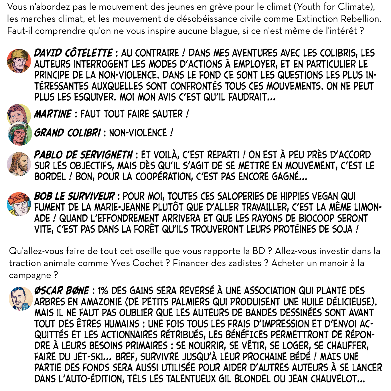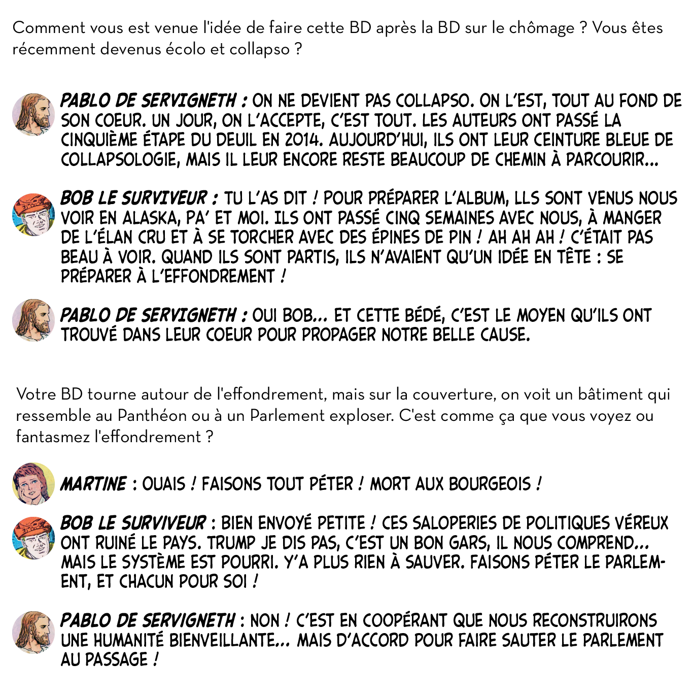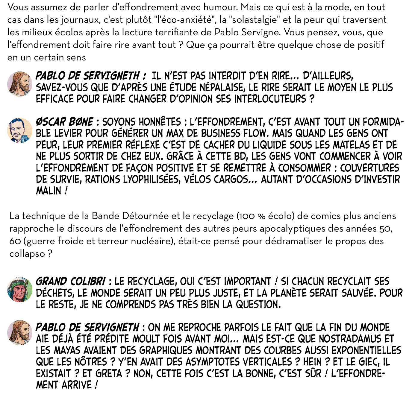 Ou plutôt, ils ont utilement caricaturé les diverses impostures qui foisonnent autour d’un thème devenu à la mode et de ses différentes récupérations politiciennes, survivalistes, universitaires ou marchandes. Dans leur Petit guide de l’effondrement, c’est aussi tout le petit milieu des effondristes et autres collapsonautes qui est amicalement représenté, avec ses grandes figures (Servigne, Bihouix, les radicaux, les non violents) et ses petites névroses. Fait notable, la production de la BD a pu profiter d’une campagne d’auto-financement très réussie, réalisant plus de 2000 préventes sur 100 initialement prévues. Pour y voir plus clair dans les raisons de ces caricatures et dans les objectifs de ces artistes qui prétendent nous faire vivre la fin du monde « dans la joie et la bonne humeur », Désobéissance Ecolo Paris est allé leur poser quelques questions. Les malicieux auteurs ont préféré laisser la parole à leurs personnages.