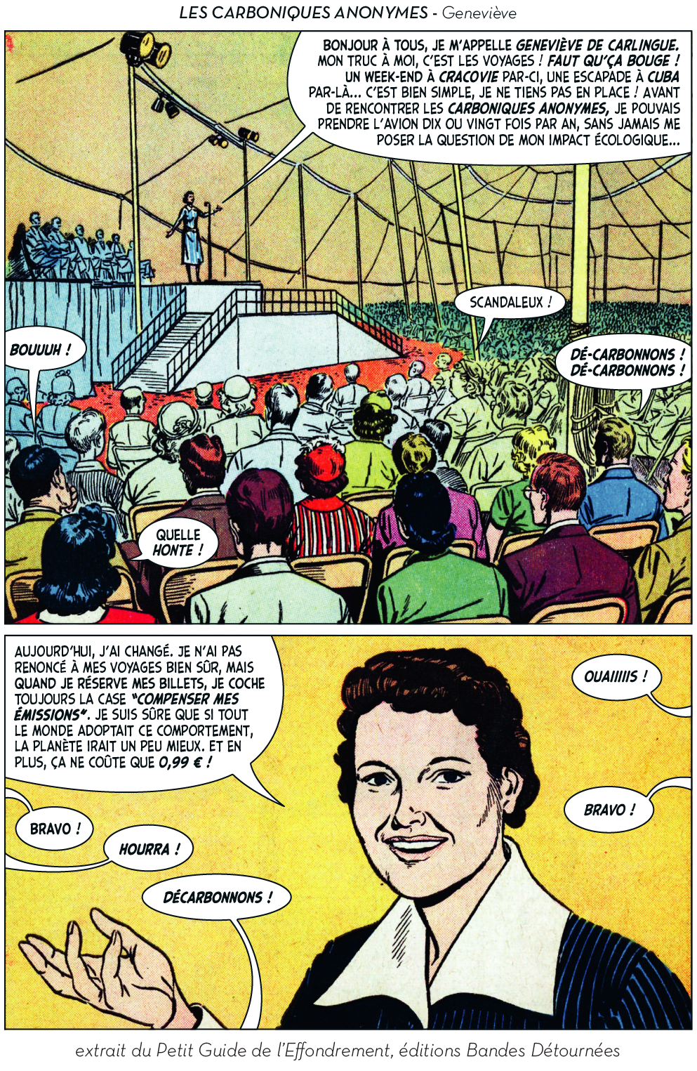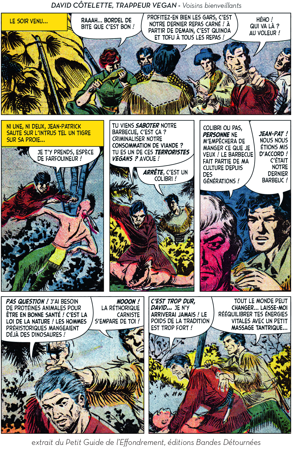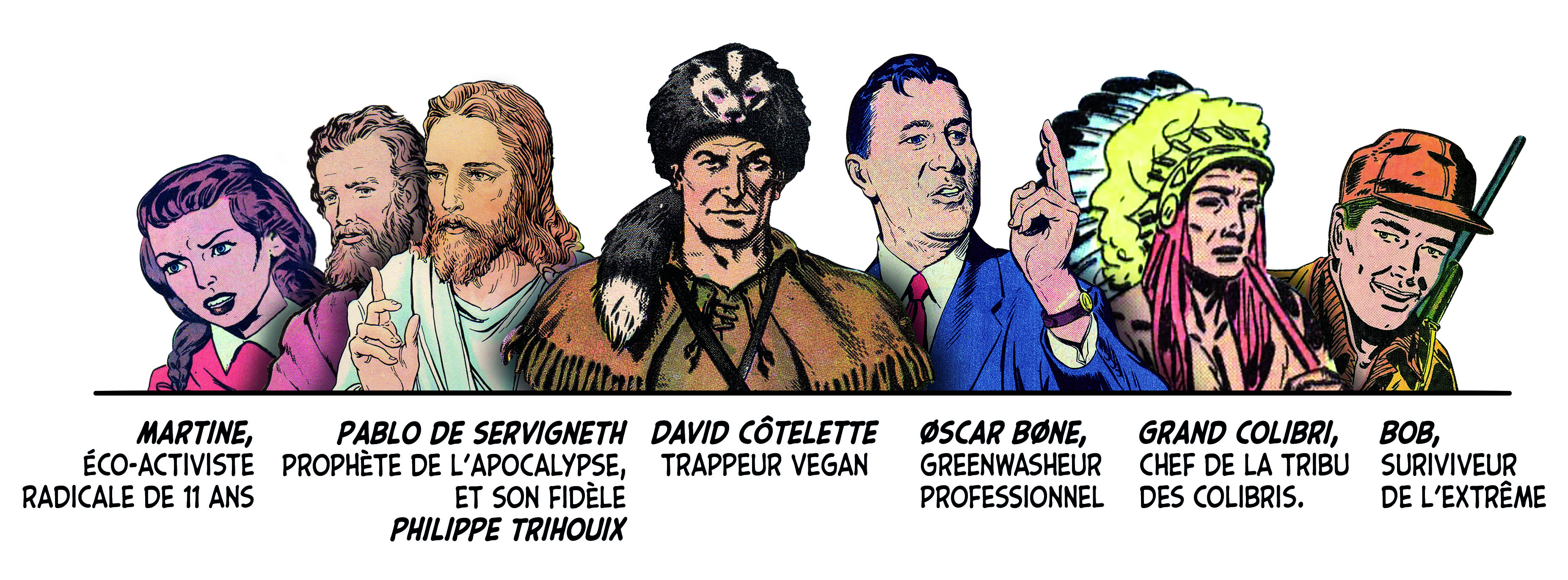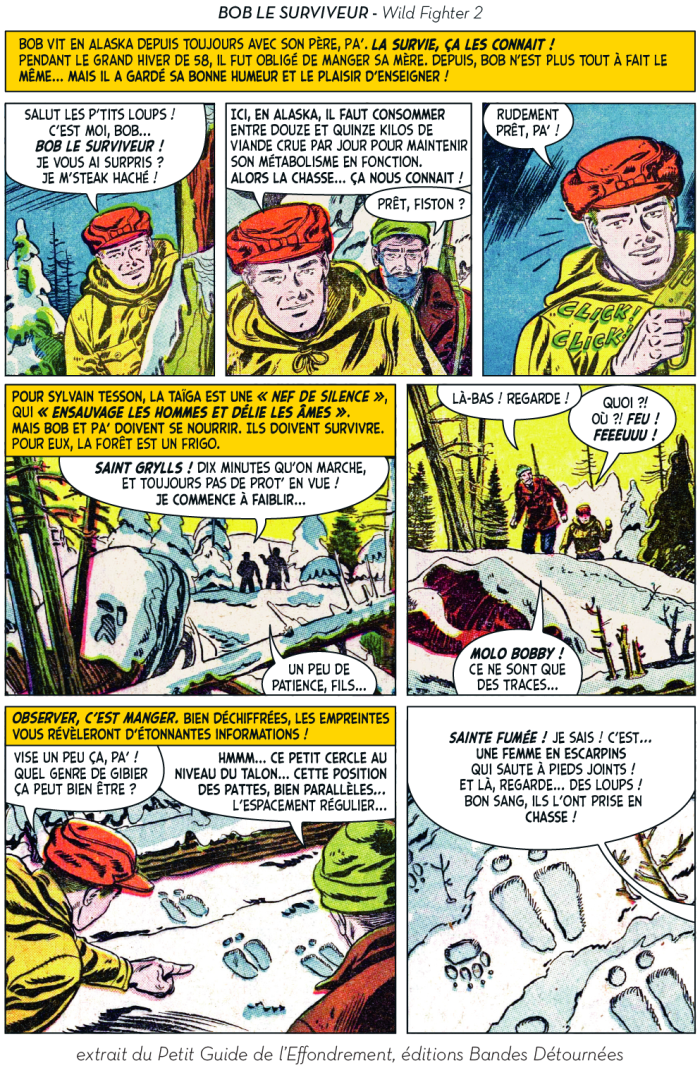Ou plutôt, ils ont utilement caricaturé les diverses impostures qui foisonnent autour d’un thème devenu à la mode et de ses différentes récupérations politiciennes, survivalistes, universitaires ou marchandes. Dans leur Petit guide de l’effondrement, c’est aussi tout le petit milieu des effondristes et autres collapsonautes qui est amicalement représenté, avec ses grandes figures (Servigne, Bihouix, les radicaux, les non violents) et ses petites névroses. Fait notable, la production de la BD a pu profiter d’une campagne d’auto-financement très réussie, réalisant plus de 2000 préventes sur 100 initialement prévues. Pour y voir plus clair dans les raisons de ces caricatures et dans les objectifs de ces artistes qui prétendent nous faire vivre la fin du monde « dans la joie et la bonne humeur », Désobéissance Ecolo Paris est allé leur poser quelques questions. Les malicieux auteurs ont préféré laisser la parole à leurs personnages.