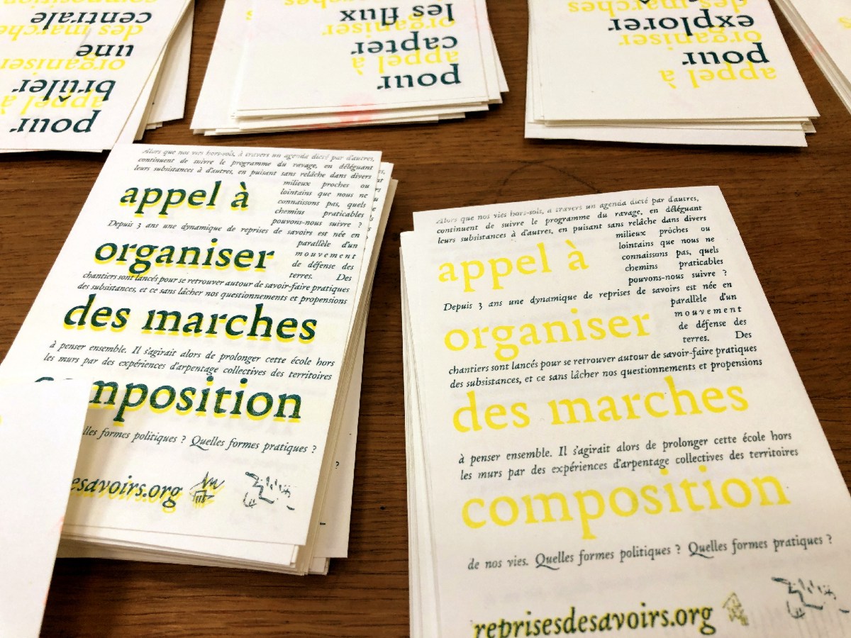 Les Marches-Composition peuvent-être une autre forme d’élaboration et d’échange de savoirs : les savoirs du quotidien, des expériences vécues, des joies simples et des violences ordinaires. En marchant ensemble on se donne la possibilité d’adopter le point de vue de l’autre, de déjouer les récits hégémoniques et de révéler les mécanismes de perpétuation du pouvoir sur le terrain, d’identifier des ennemis communs et de fomenter des alliances fertiles. Elles s’inscrivent dans un cheminement, comme un des maillons nécessaires à la fabrications d’écoles terrestres, d’écoles bio-régionales, d’écoles du démantèlement. Les marches composition, restent à inventer, problématiser, expérimenter... Mais concrètement, pour se lancer et organiser une telle marche, il faut des gens, une date, un fil problématique, un bout de territoire... On tente par ici de donner quelques pistes pratiques > reprisesdesavoirs.org/
