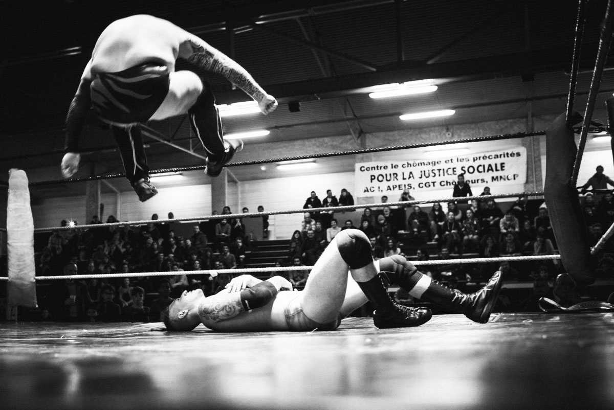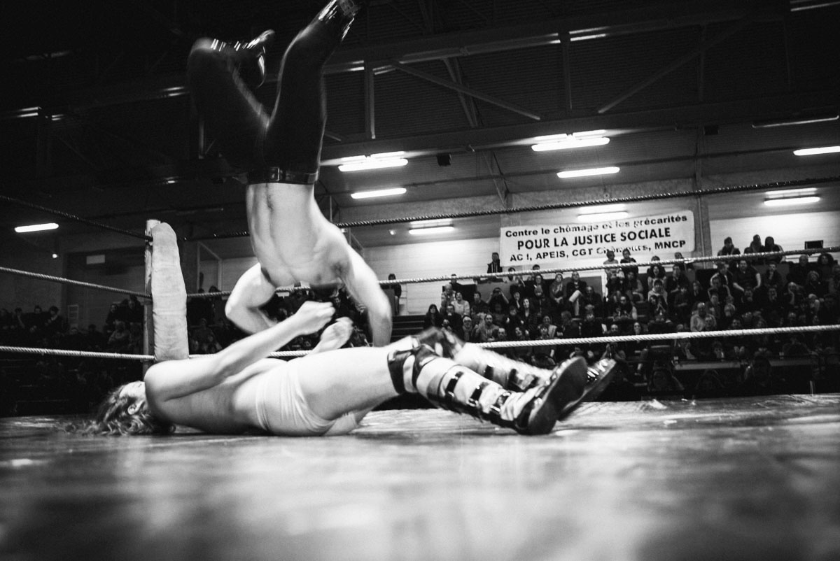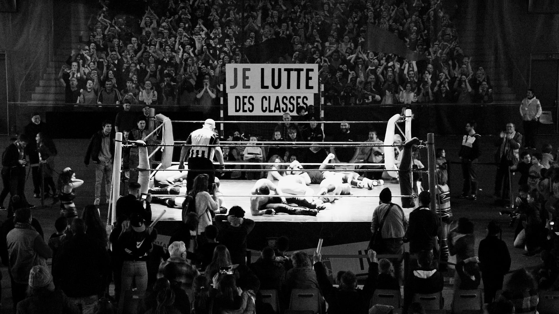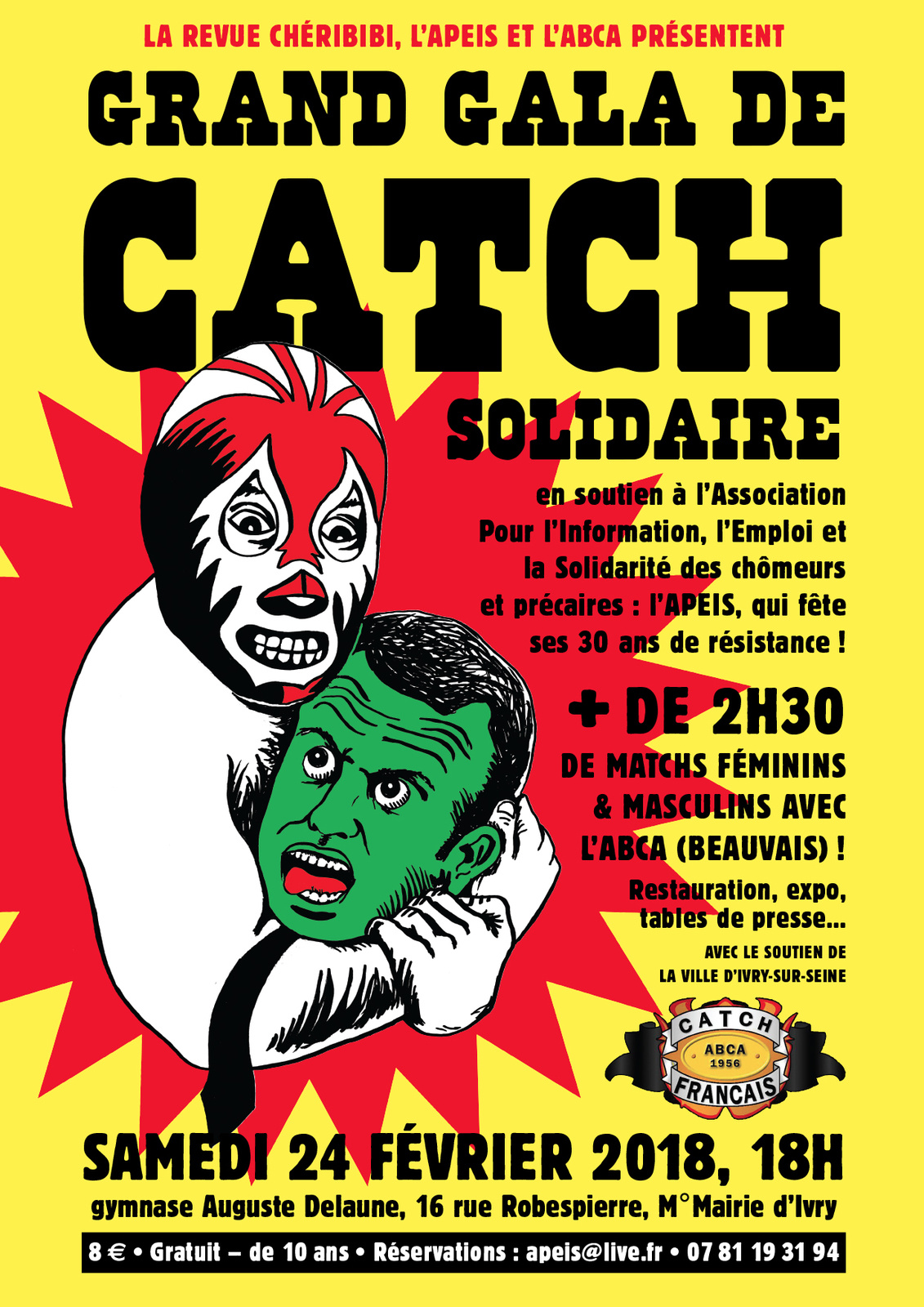 Organiser un gala de catch en soutien à notre asso de chômeurs, l’Apeis ? Si l’idée faisait marrer tout le monde, peu semblaient y croire. La municipalité d’Ivry mettait à notre disposition le gymnase Auguste Delaune, temple du handball d’une jauge de 1477 places ; on avait 500 affiches et 5000 flyers à dispatcher ; une dizaine de catcheurs de l’ABCA (la plus vieille école de catch de France) ; une fanfare de 13 personnes (le Bellette Brass Band !) ; la cantine des Bokhalés qui préparait plus de 500 repas ; des fûts de bière… et moults frais divers. Fallait pas se louper, sous peine de transformer une soirée de solidarité en gouffre financier. Mais surtout, au-delà des questions triviales de pognon, ce gala allait prouver ou infirmer ce que l’on défend depuis si longtemps (dans ChériBibi et ailleurs) : la culture populaire, tant méprisée des élites, est l’antithèse de cette « culture de masse » décérébrante et mercantile qu’on nous sert matin, midi et soir. La culture populaire, culture de classe, fabrique de la fraternité et, de fait, peut réunir un public éclectique autour de bonheurs combatifs.