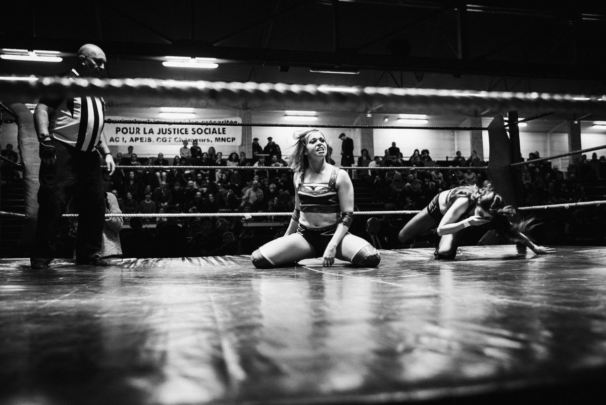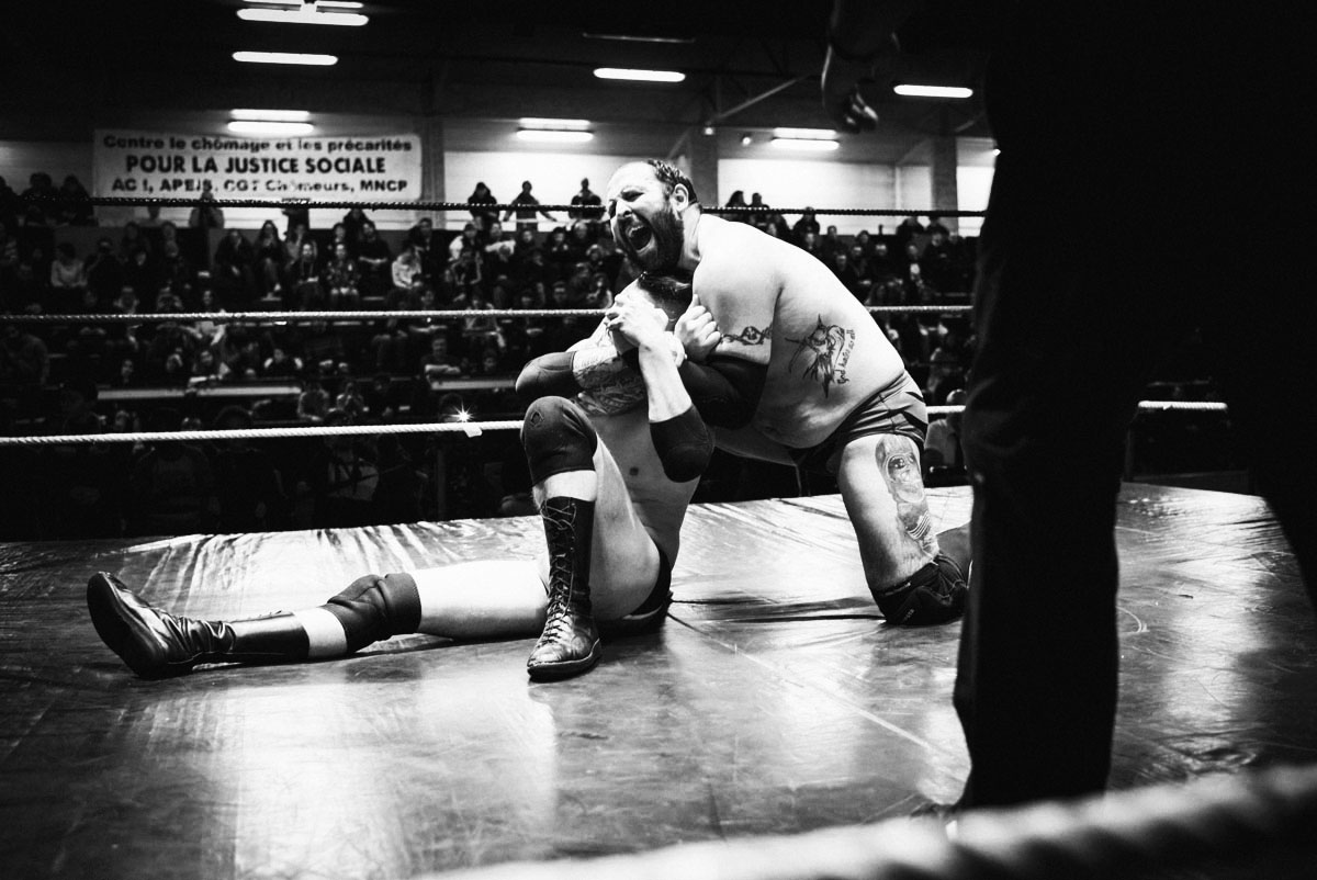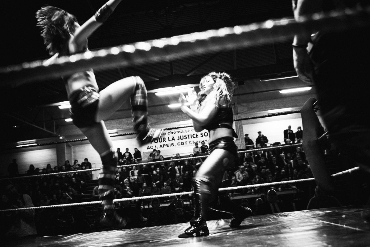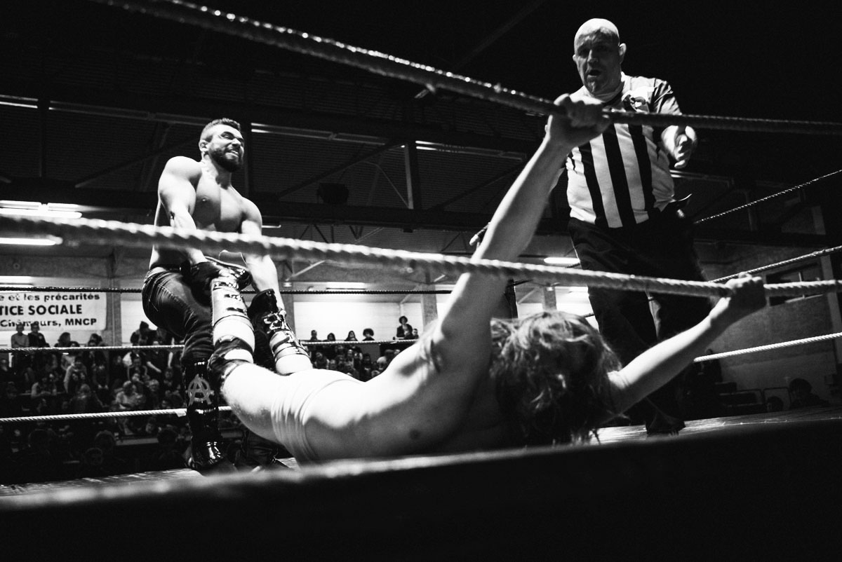 Organiser un gala de catch en soutien à notre asso de chômeurs, l’Apeis ? Si l’idée faisait marrer tout le monde, peu semblaient y croire. La municipalité d’Ivry mettait à notre disposition le gymnase Auguste Delaune, temple du handball d’une jauge de 1477 places ; on avait 500 affiches et 5000 flyers à dispatcher ; une dizaine de catcheurs de l’ABCA (la plus vieille école de catch de France) ; une fanfare de 13 personnes (le Bellette Brass Band !) ; la cantine des Bokhalés qui préparait plus de 500 repas ; des fûts de bière… et moults frais divers. Fallait pas se louper, sous peine de transformer une soirée de solidarité en gouffre financier. Mais surtout, au-delà des questions triviales de pognon, ce gala allait prouver ou infirmer ce que l’on défend depuis si longtemps (dans ChériBibi et ailleurs) : la culture populaire, tant méprisée des élites, est l’antithèse de cette « culture de masse » décérébrante et mercantile qu’on nous sert matin, midi et soir. La culture populaire, culture de classe, fabrique de la fraternité et, de fait, peut réunir un public éclectique autour de bonheurs combatifs.
