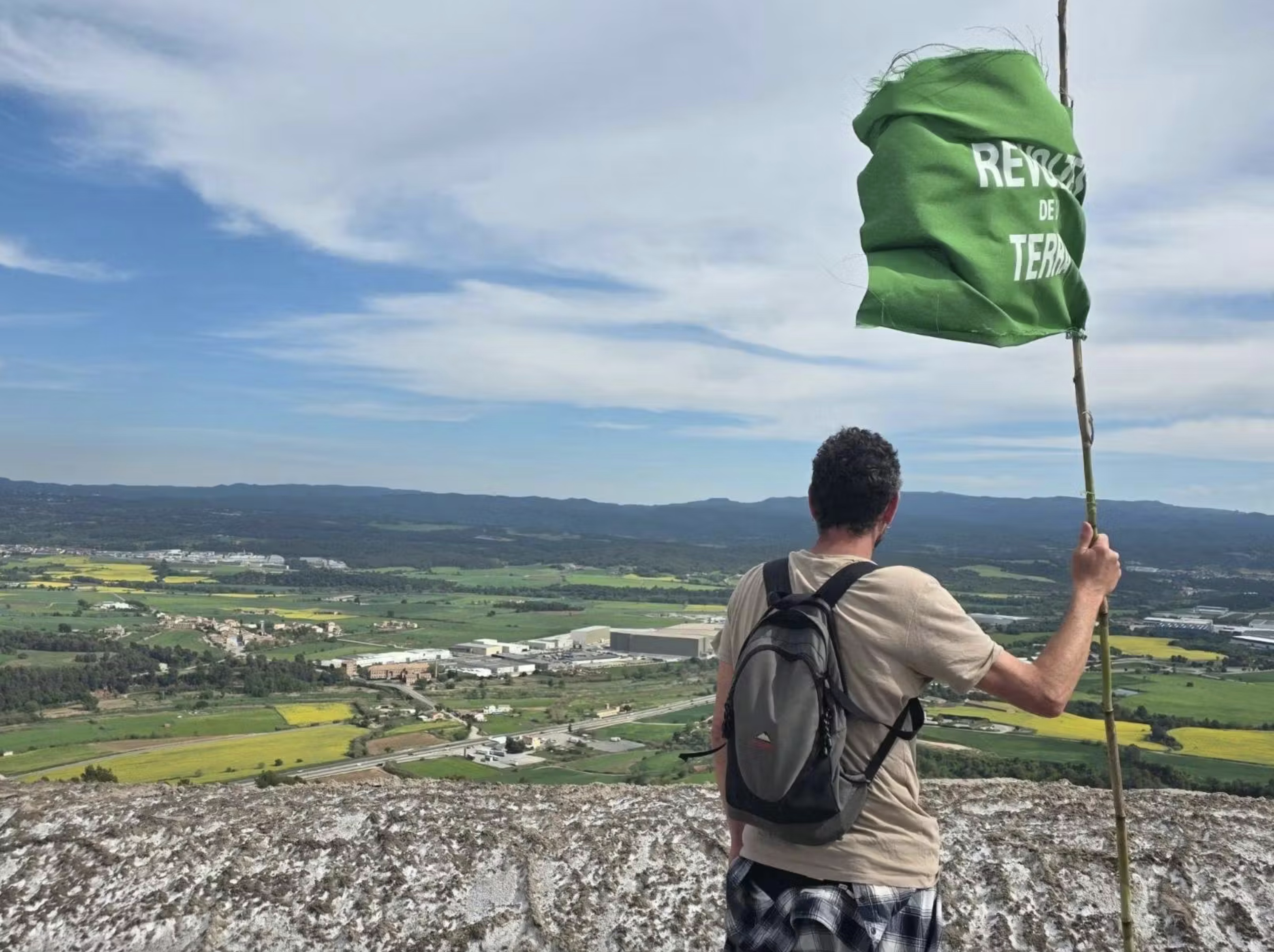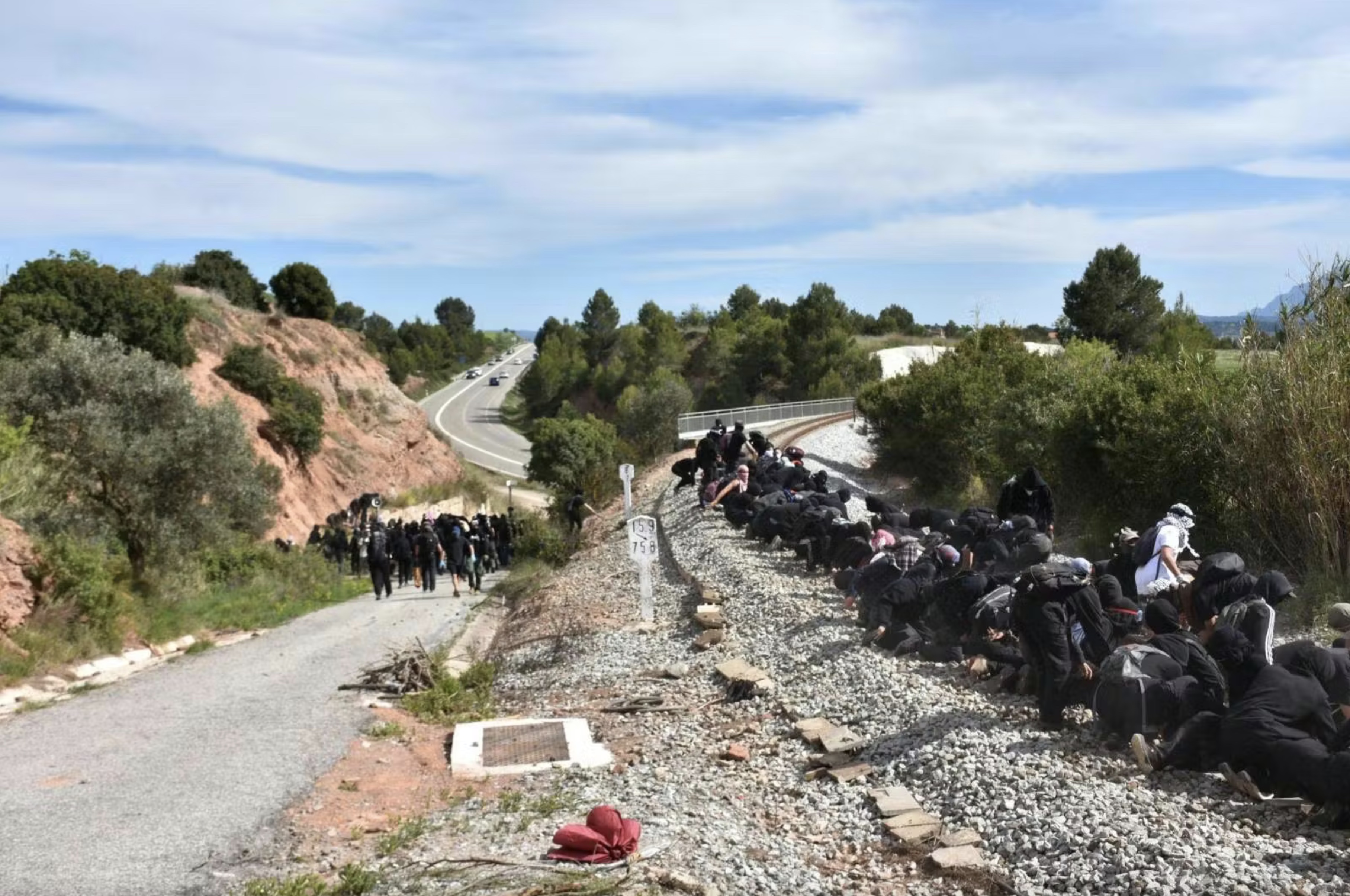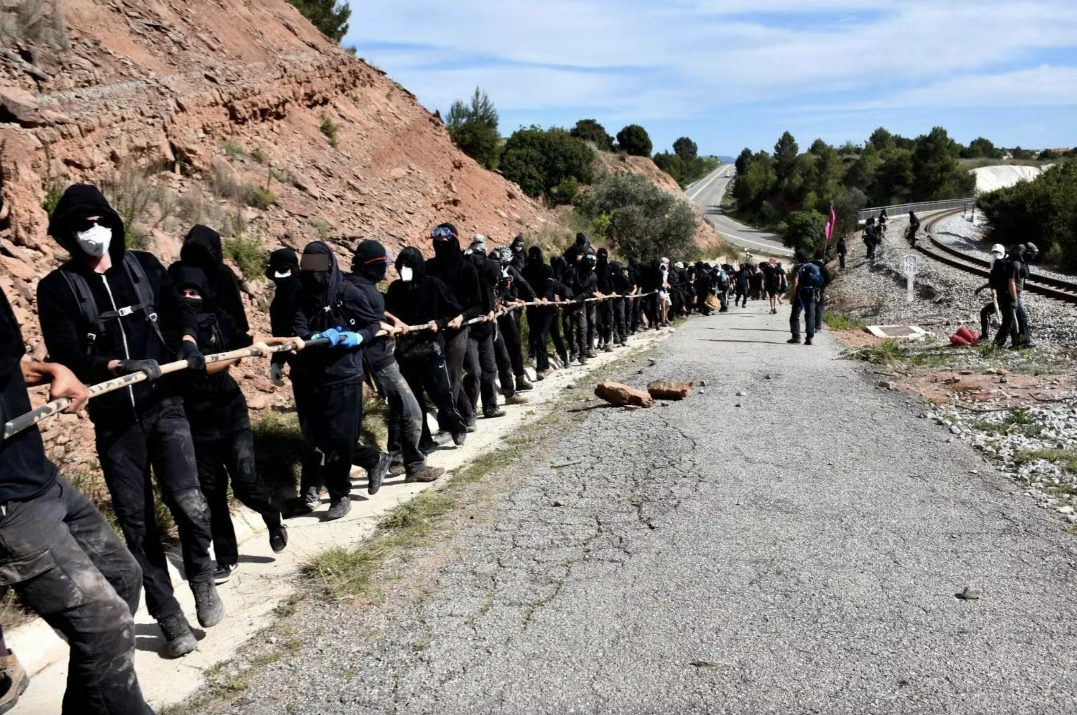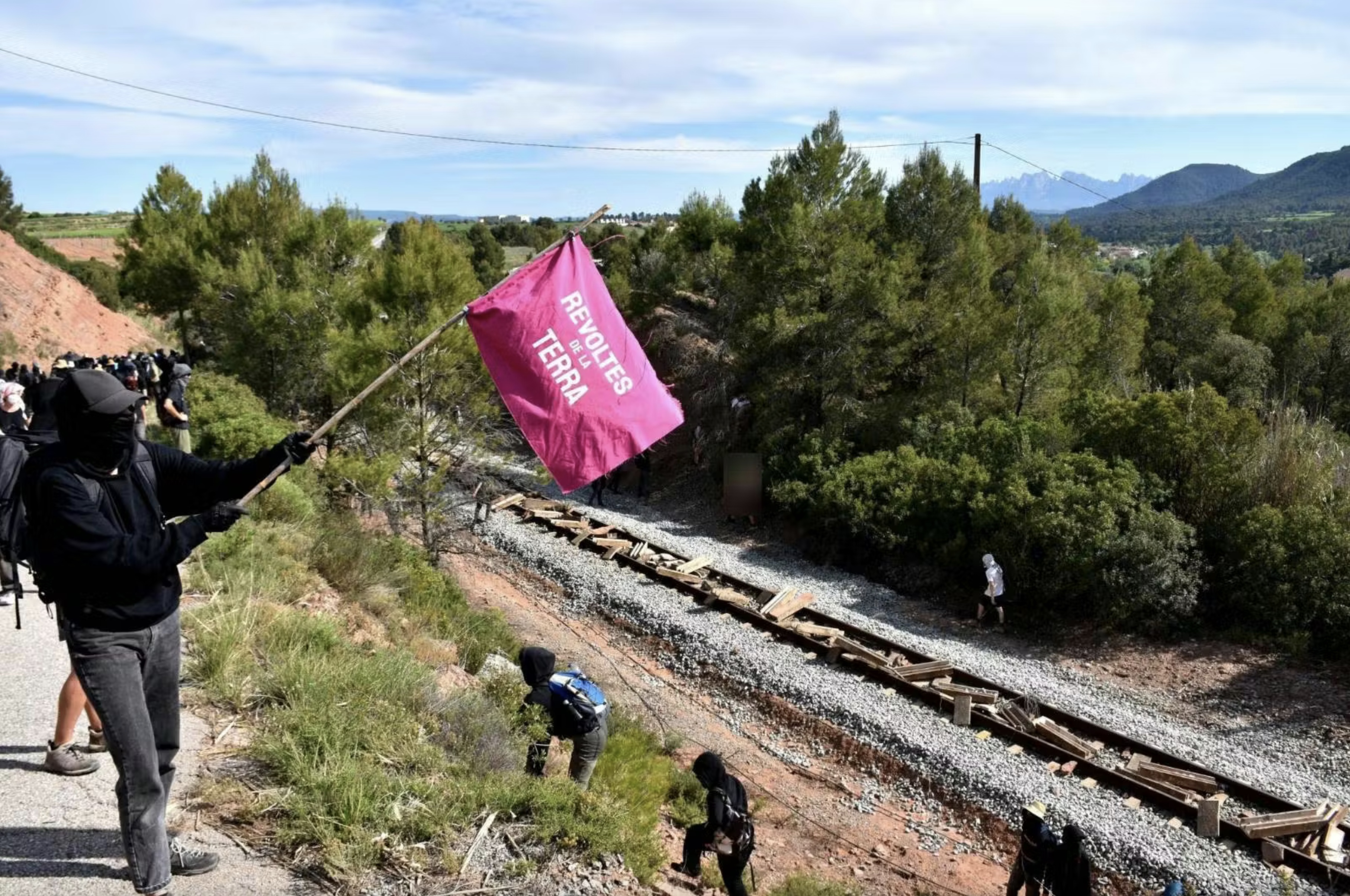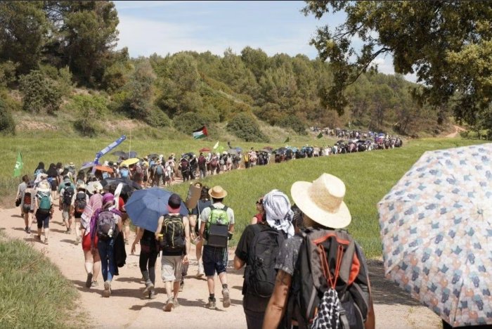 Une marche à couvert démarre en montée abrupte dans les sous-bois, Manresa dans la vallée et le Montserrat au loin. Une demi-heure plus tard, un chemin de fer est en vue. C’est lui qui permet à Israel Chemicals d’acheminer plusieurs trains par jour remplis de potasse destinée aux engrais utilisés par l’agro-industrie. La pente est alors dévalée rapidement en s’équipant de branchages au passage. Des barricades sont montées sur la route qui descend jusqu’au chemin de fer et une bonne partie des 600 personnes envahissent les voies. Dans une église qui nous surplombe, le tournage en cours d’un film en costume est interrompu par une scène autrement plus pimentée. Quatre camions de police arrivent pour leur part quelques minutes plus tard par la voie rapide toute proche, mais trop tard, la place est prise. Ils s’installent un peu plus loin en contrebas. En mauvaise position et en sous-nombre, ils se résignent à ne pas intervenir face à la foule déterminée à stopper quelques temps l’extractivisme au profit d’une entreprise israélienne qui soutient activement l’armée génocidaire. Une banderole déployée avec le mot d’ordre ‘Del Llobregat al Jorda, ni genocidi ni ecocidi’ (du Llobregat au Jourdain, ni génocide ni écocide) fait le lien entre le fleuve local impacté par la mine et l’emblématique fleuve palestinien.