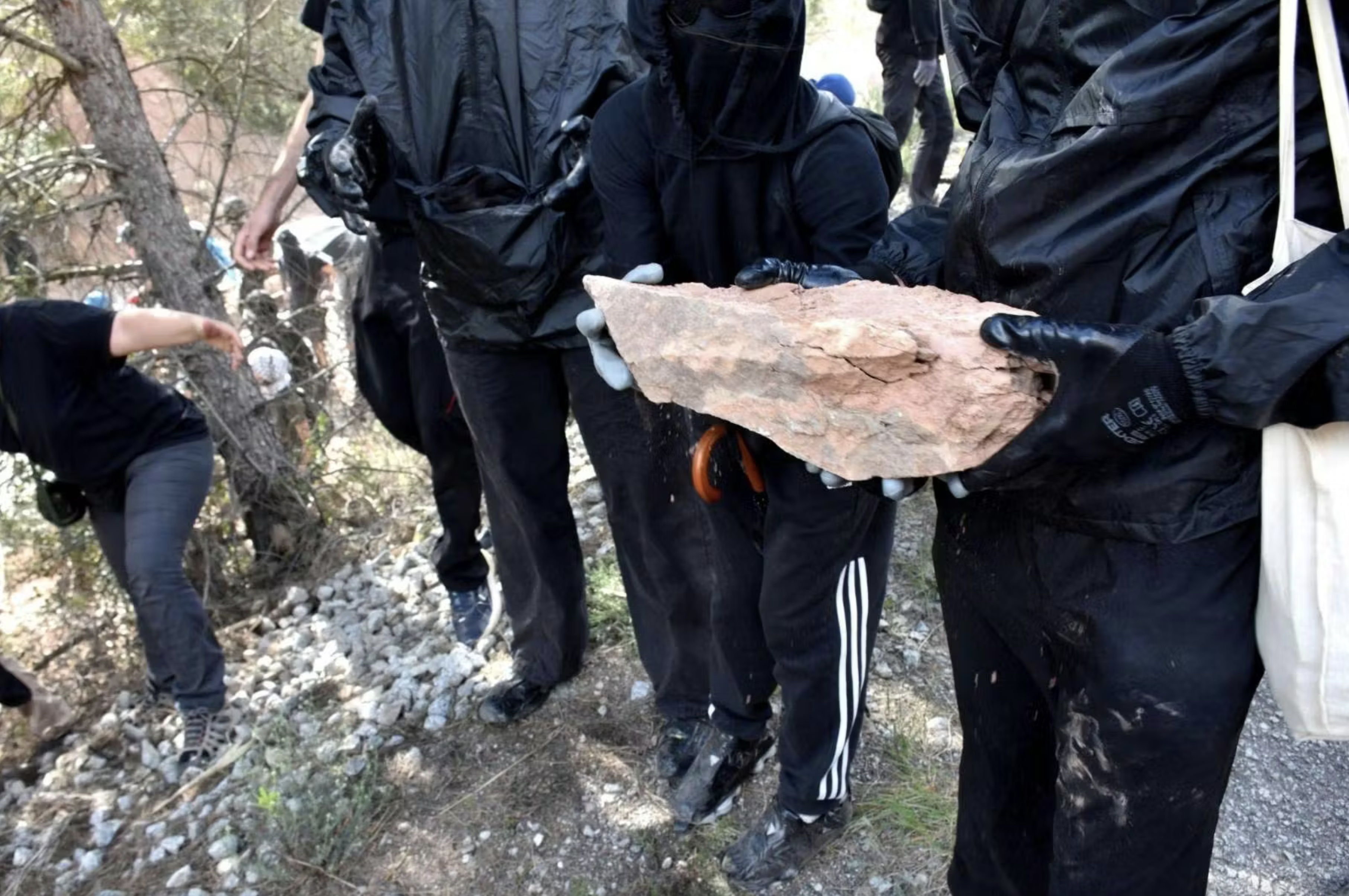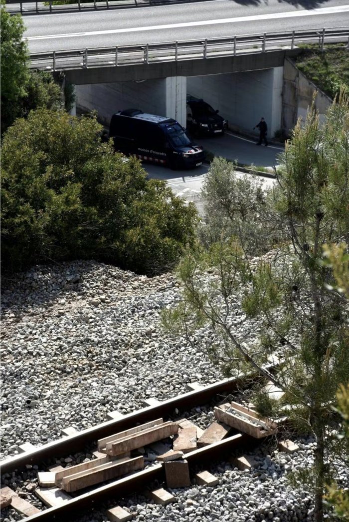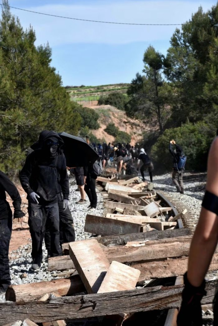 Un grand chantier de désarmement se déploie rapidement : le ballast qui stabilise la voie ferrée est massivement dégagé, avant que de nombreux débris de toutes sortes s’accumulent à sa place. Le gros câble électrique qui la longe est précautionneusement tiré hors de son chemin de béton. Ce dernier est cassé en mille morceaux qui se retrouvent sur les rails. L’énergie est impressionnante et en quelques dizaines de minutes l’infrastructure est sérieusement endommagée. Avant que les renforts policiers arrivent, le cortège remonte les sentiers en chantant dans la forêt jusqu’à la ligne de crête. Nous apprendrons plus tard qu’un groupe indépendant à lui aussi saboté efficacement les voies à quelques kilomètres de là en les soulevant à l’aide de simples crics. Les différents cortèges se retrouvent au camp quelques temps plus tard et se racontent leur parcours dans l’effusion et les embrassades. C’est la seconde mobilisation de nos cousin-es des Revoltas de la terra, et chacun.e se dit ce soir que quelque chose est train de prendre ici qui appelle à poursuivre l’aventure.