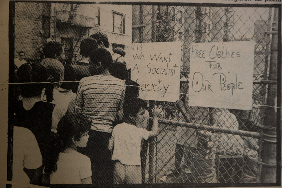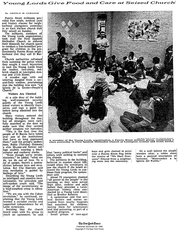NEW YORK TIMES (30 décembre 1969) : « Les Young Lords offrent soins et nourriture dans une église occupée ». Un panneau de bois avec des lettres rouges pendait d’une fenêtre du deuxième étage, annonçant que l’édifice était désormais « la Iglesia de la Gente [l’église du peuple] ».