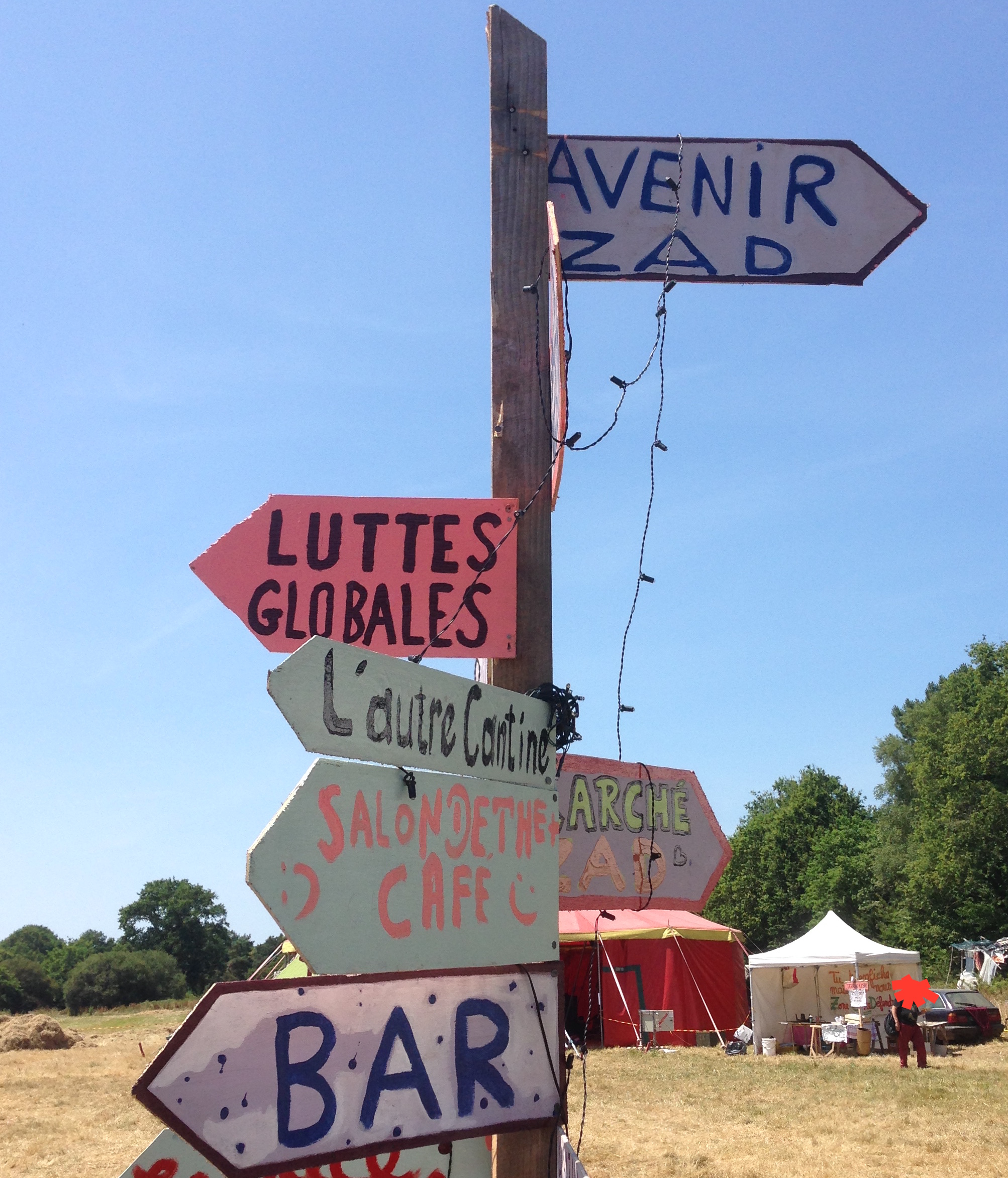 Nous qui venions par la piste et de nuit pour échapper aux contrôles de police amenant matériels et espoirs nous avons essayé d’échapper au parking et au ressentiment. Nous avons vu ressurgir les inscriptions municipales sur les panneaux effacés et fleurir les sens interdits. Là où les revendications et slogans internationalistes envahissaient l’espace visuel ne subsiste que la sécheresse universelle du code de la route. Ici aussi, dans la signalétique, l’utilisation de l’esthétique ennemie nous à déçu.es. A nos yeux rien ne peut justifier un « roulez au pas » là ou des barricades arrêtaient les voitures de fait. Nous avons été mis.es au pas avec un pincement au coeur en prenant la route des chicanes lisse et proprette en direction du camping. Vous l’aurez compris, nous avons été révolté.es et ému.es par des choses aussi vulgaires que le quadrillage au cordeau ou les rubalises coupant les champs pour contenir les promeneur.ses comme ces filets tendus dans la forêt de Rohane qui arrêtaient les gendarmes.