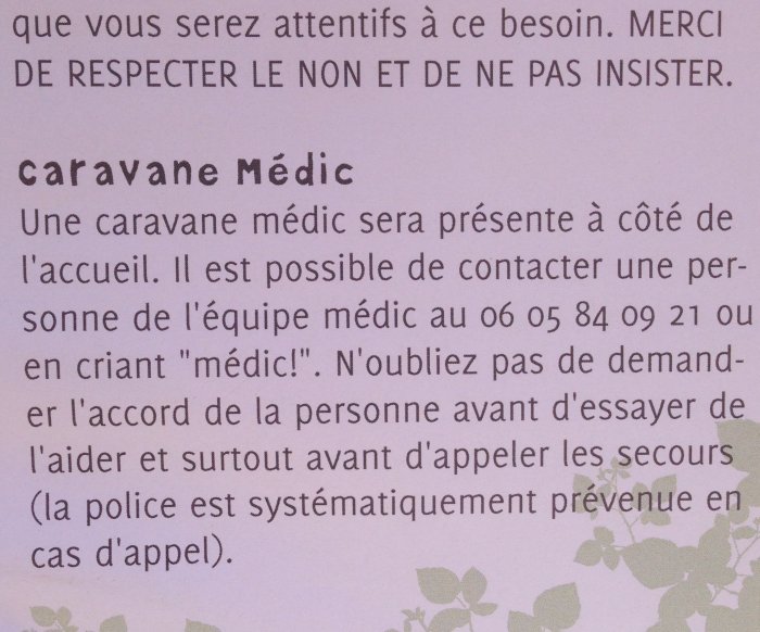 On exagère. Il en restait, des vestiges. Par exemple, à l’entrée du parking, sous un souvenir de tripode, quelques humain.es, quelques rhubarbes fanées à prix libre et une récup de pains au lait pour le folklore, et même un feu et un drapeau pirate. Une réserve d’indien.nes, une attraction régionale pour promeneur.ses à semelles blanches. Sur la tente infos, un panneau bien imprimé, fond blanc et motifs numériques de feuilles, proposait même de pratiquer soi-même quelques usages tribaux : hurler « médic ! » aux quatre vents si Monsieur déclenche une allergie à l’herbe, si Madame s’égratine avec une ronce ou si Junior a besoin de mercurochrome sur son mollet bien nourri. Hurler « médic ! », sans risque, comme pour de vrai ! De vrai.es petit.es émeutier.es. Où est la cabine pour la photo souvenir ?