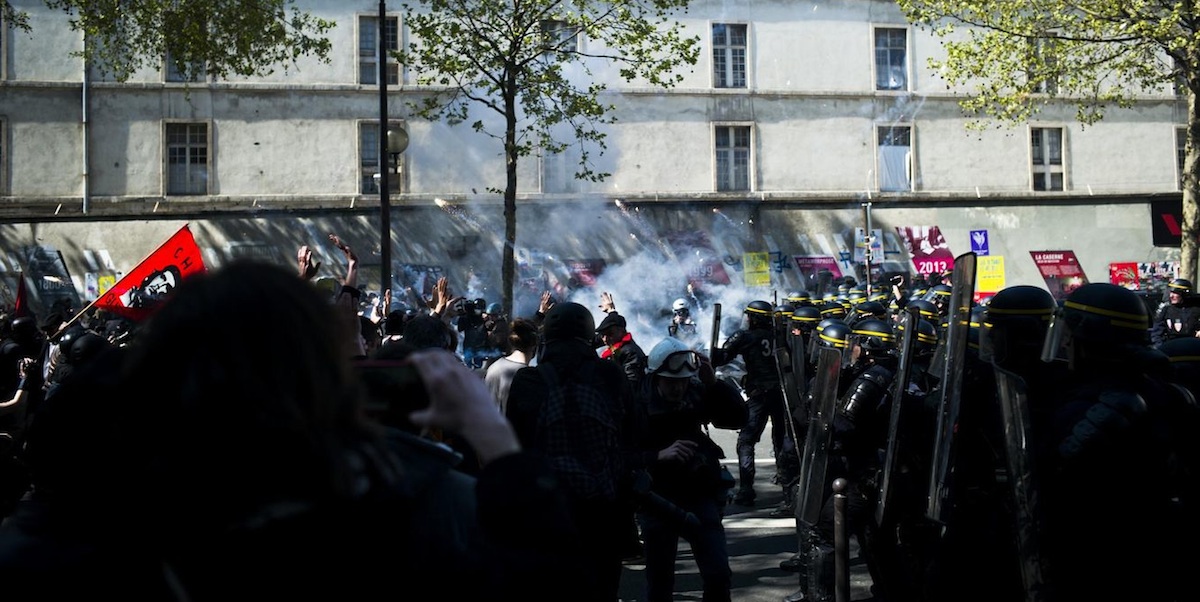 - empêcher la police de couper le cortège. Il y a déjà une grande attention des manifestants à cette question. Le 28 avril, une première tentative de couper le cortège a été empêchée relativement simplement. Le 1er mai, les manifestants (en tête) ont tout fait pour éviter l’incursion de lignes de policiers sur les côtés, avec un relatif succès (« pas de batards sur les trottoirs ! »). Mais avoir la certitude que la police ne puisse pas « couper » (même en situation d’affrontement, qui est le moment qu’elle privilégie généralement) exigerait un autre niveau d’organisation. Cela nécessiterait que des gens endossent cette tâche avec tout le matériel et les risques que cela implique. Mais le « cortège de tête » a t-il vraiment envie d’être un bloc hermétique (à la police, mais certainement aussi au reste) ? C’est-à-dire de s’enfermer derrière des banderoles, des casques et des bâtons – en somme, derrière un service d’ordre ? Jusqu’à présent c’est plutôt le caractère « lâche » (distendu) du cortège de tête qui a rendu complexe son isolement par la police.