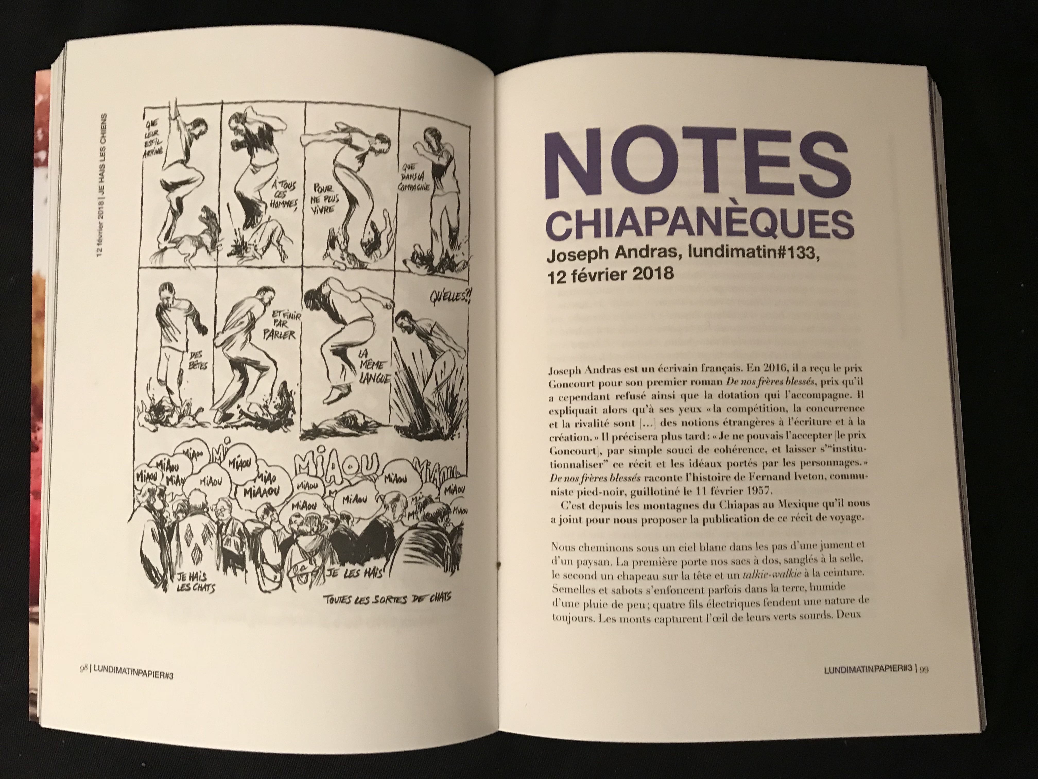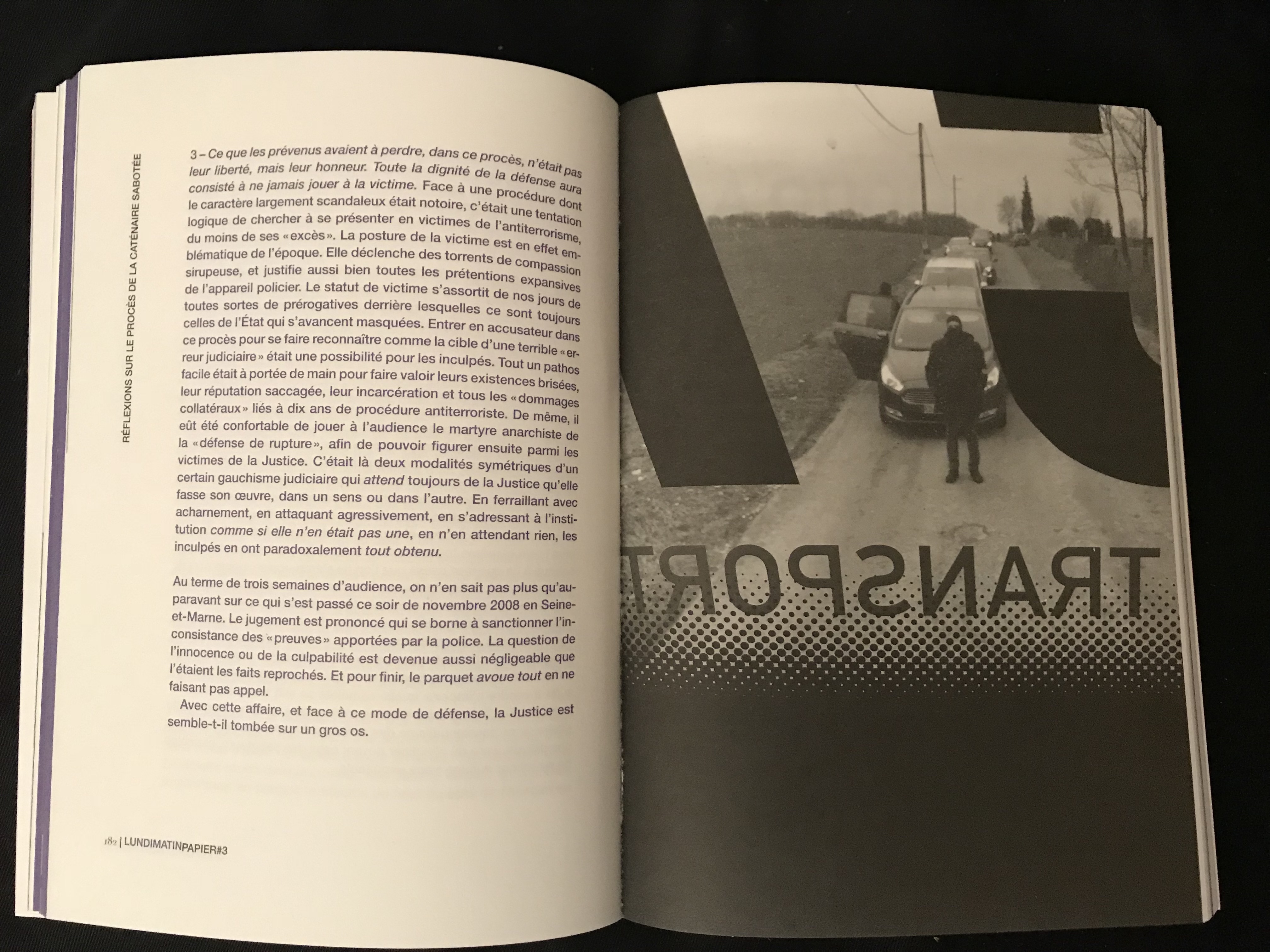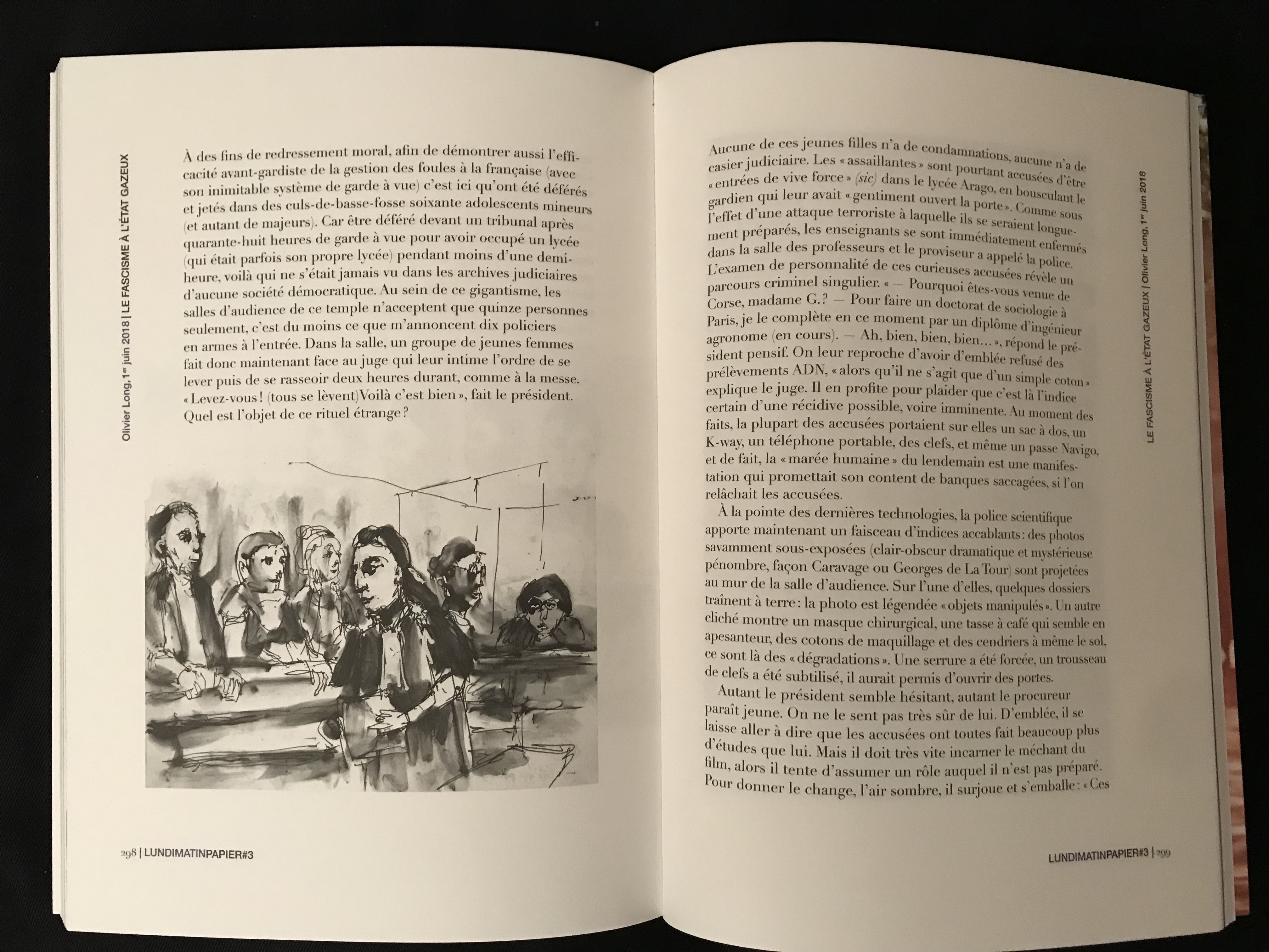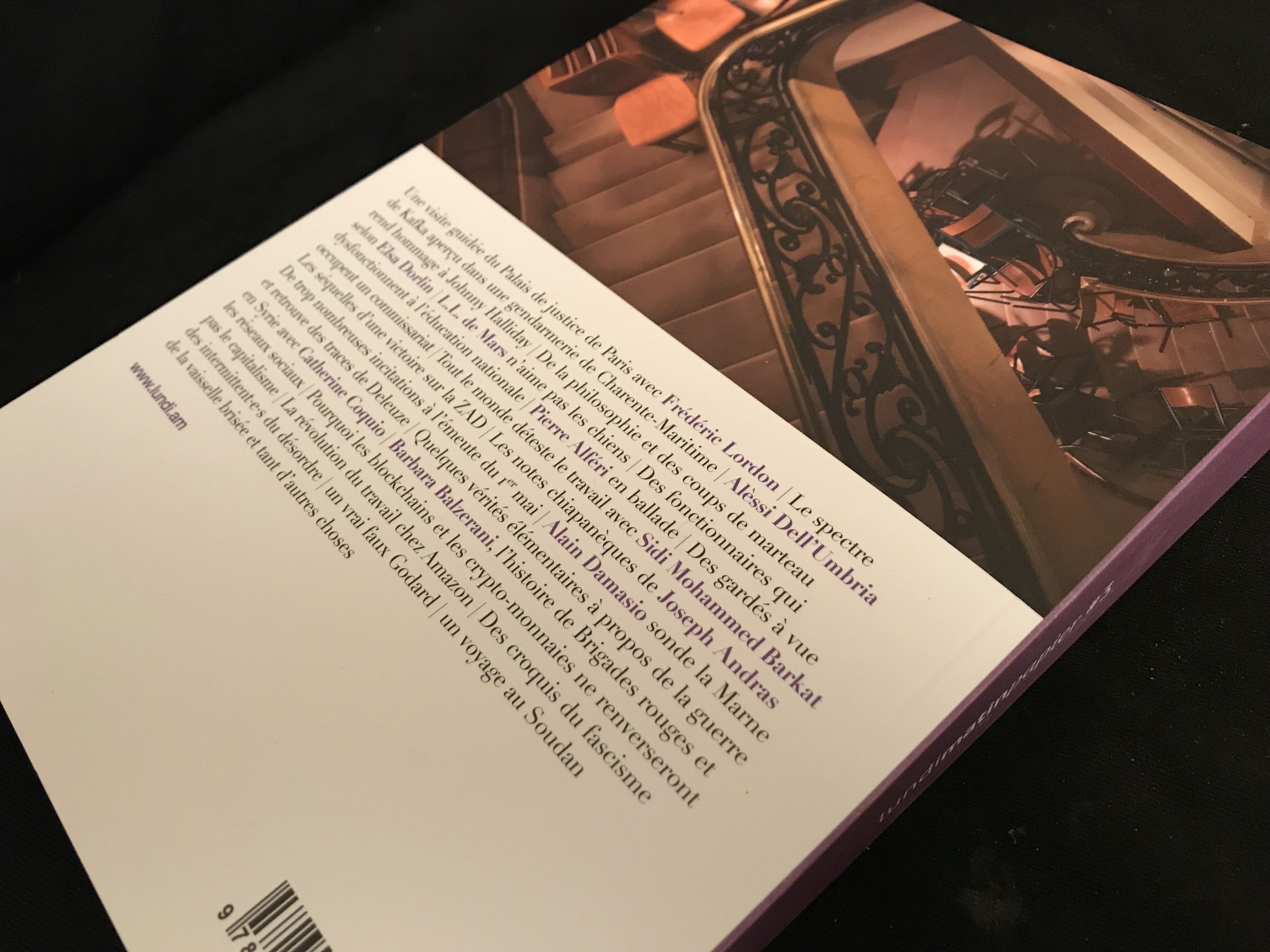 Une visite guidée du Palais de justice de Paris avec Frédéric Lordon | Le spectre de Kafka aperçu dans une gendarmerie de Charente-Maritime | Alèssi Dell’Umbria rend hommage à Johnny Halliday | De la philosophie et des coups de marteau selon Elsa Dorlin | L.L. de Mars n’aime pas les chiens | Des fonctionnaires qui dysfonctionnent à l’éducation nationale | Pierre Alféri en ballade | Des gardés à vue occupent un commissariat | Tout le monde déteste le travail avec Sidi Mohammed Barkat | Les séquelles d’une victoire sur la ZAD | Les notes chiapanèques de Joseph Andras | De trop nombreuses incitations à l’émeute du 1er mai | Alain Damasio sonde la Marne et retrouve des traces de Deleuze | Quelques vérités élémentaires à propos de la guerre en Syrie avec Catherine Coquio | Barbara Balzerani, l’histoire de Brigades rouges et les réseaux sociaux | Pourquoi les blockchains et les crypto-monnaies ne renverseront pas le capitalisme | La révolution du travail chez Amazon | Des croquis du fascisme des intermittentes du désordre | Un vrai faux Godard | Un voyage au Soudan | de la vaisselle brisée et tant d’autres choses...